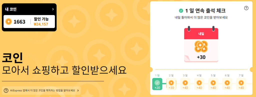 알리익스프레스에서는 프로모션 코드 할인 외에도 코인을 모아서 할인을 받는 방법이 있습니다.