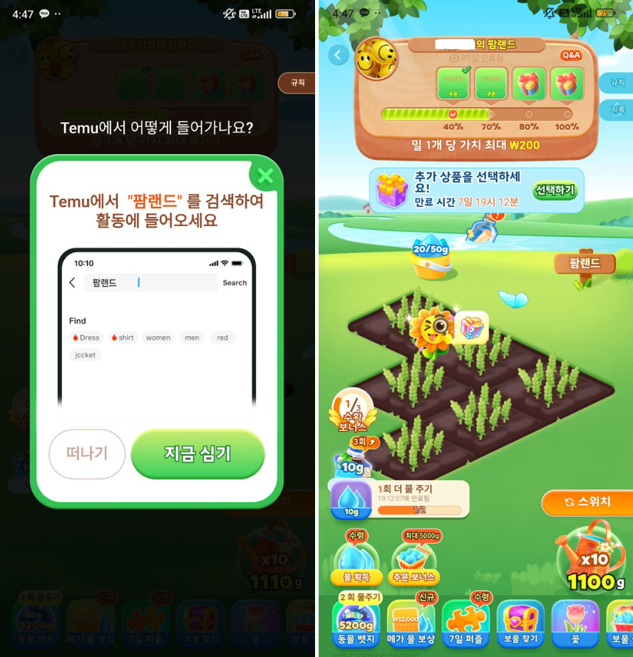 TEMU에서는 미니게임인 팜랜드를 운영하고 있는데 팜랜드를 통해 다양한 할인쿠폰 및 무료사은품 등과같은 혜택을 받을 수 있음
